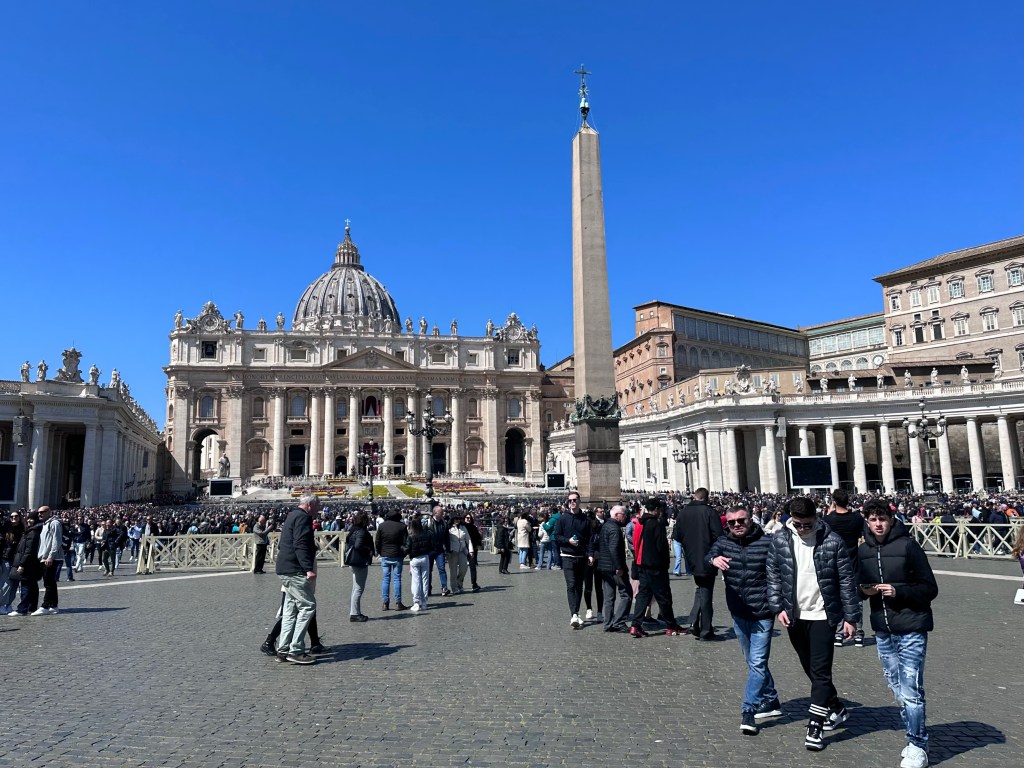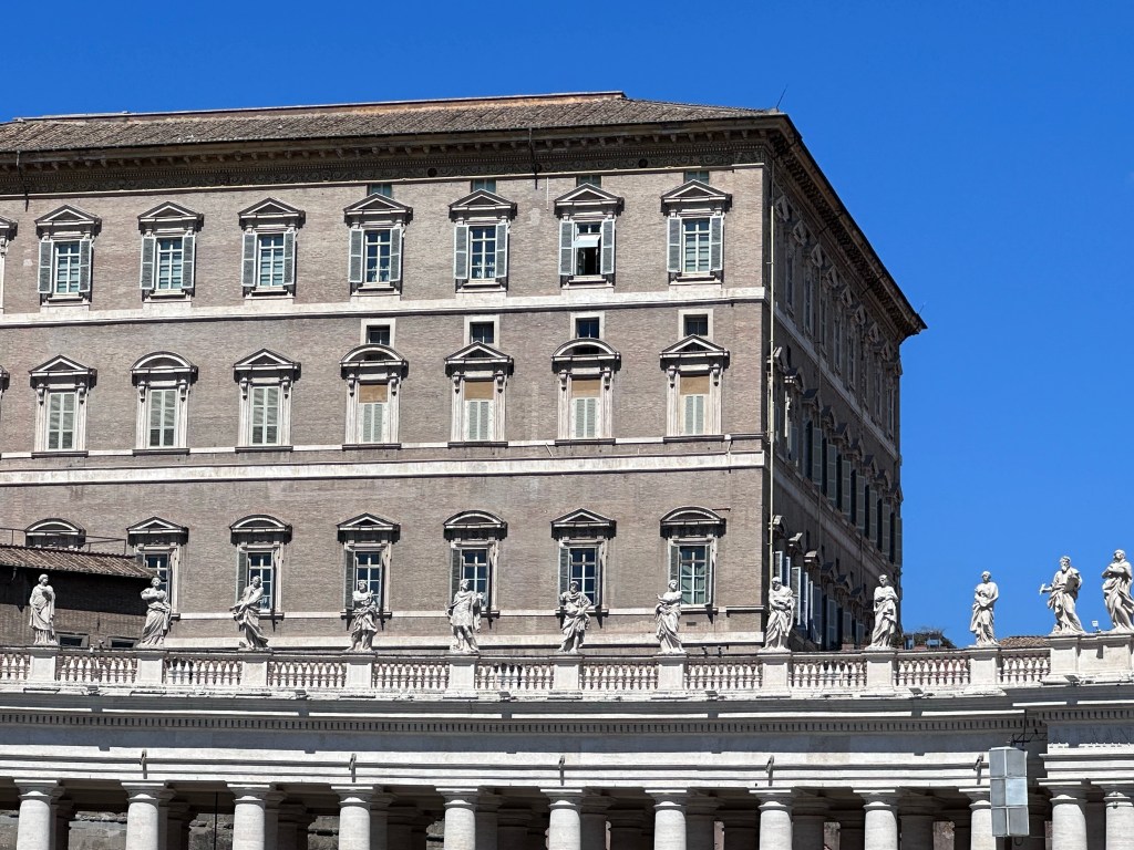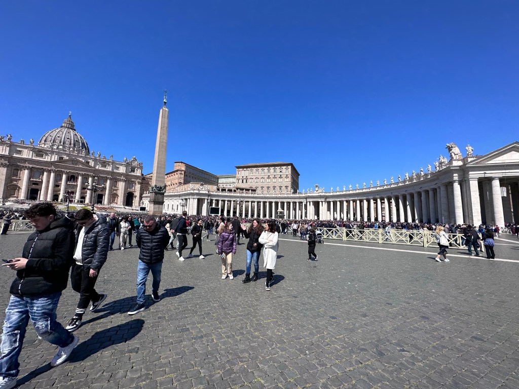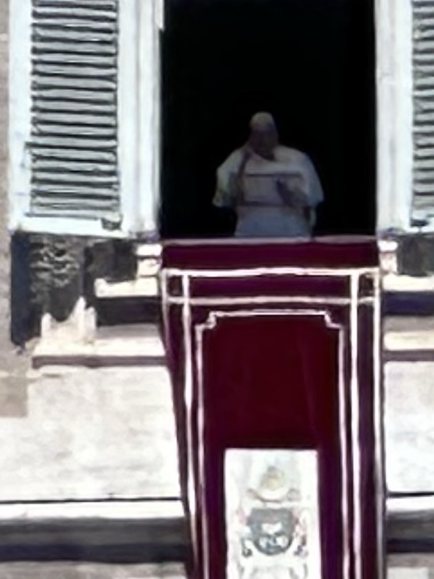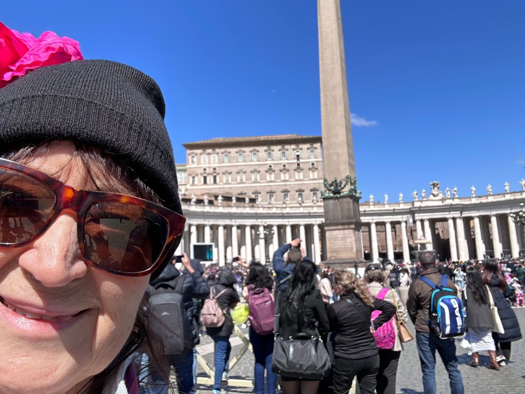 Wowie-ka-zowie, Batman! Robbin saw the pope! Yes, really!!! Barry & I had free time at the Vatican. We heard everyone cheering when Pope Francis started speaking. He spoke from a window on the building on the right. Top row, second window from the right. He gave a blessing! Pope Francis spoke for about 15 minutes. I got a tear in my eye while videoing him. Incredible! This really is a Buona Pasqua Happy Easter …Holy Monday! perhaps