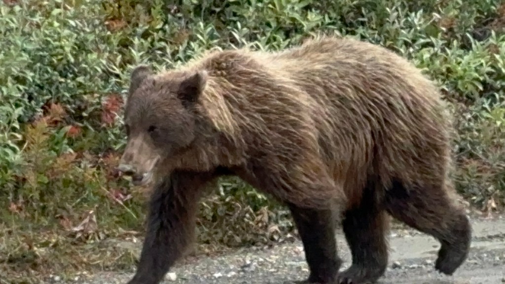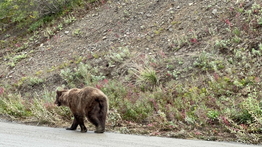 After that, it was quite a while before we spotted anything else. Then suddenly there was a grizzly bear walking down the road headed towards us!